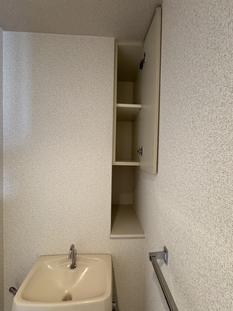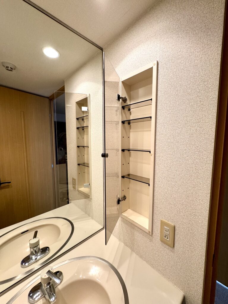 洗面台横のミラーキャビネット、トイレ上部の棚、